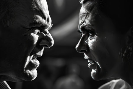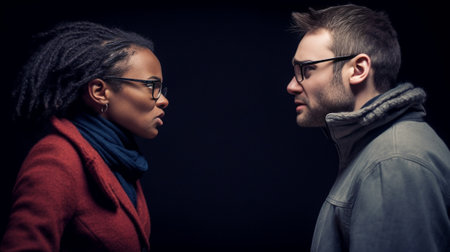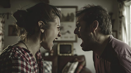 family conflicts, an angry, irritated man and woman engaging in emotional stress as they talk and glare at each other with annoyance, within the confines of their home