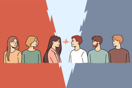 Determined men and woman stand opposite look in eyes