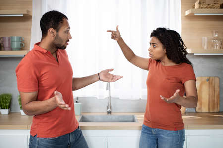 Upset disappointed millennial african american lady and husband swears and gesticulate at kitchen interior