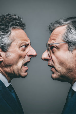 Two businessmen screaming at each other with aggressive facial expressions