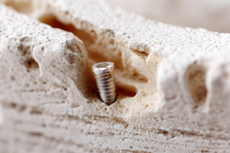 Detailed view of a dental implant located in natural bone texture reveals the intricate interplay of materials in a macro setting, emphasizing its integration.