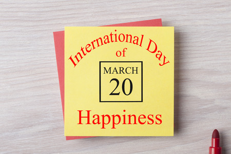20 March International Day of Happiness written on note and marker pen. Business Concept. Top view.