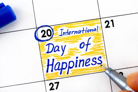 Woman fingers with pen writing reminder International Day of Happiness in calendar. March 20.