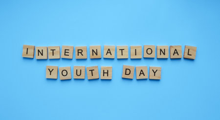 August 12, International Youth Day, minimalistic banner with the inscription in wooden letters on a blue background