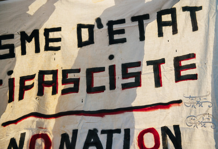 STRASBOURG, FRANCE - FEB 6, 2016: Protesters marching with no border no nation placard during a demonstration against government's plan to extent the 'state of emergency' and for opened borders