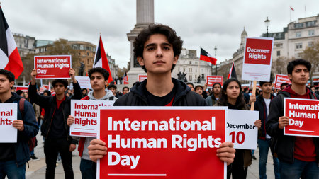 Crowd gathers in protest, man expresses passion and determination under cloudy sky