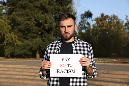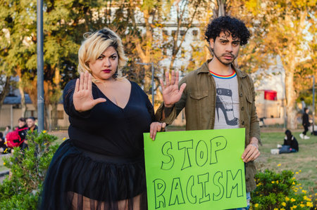 young, serious caucasian man and woman protesting in the park with hands on stop, holding sign that says stop racism, inclusive concept.