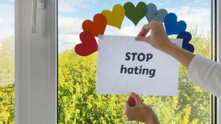 hand hanging sheet of paper with word Stop hating under rainbow. Lgbt equality and tolerance concept
