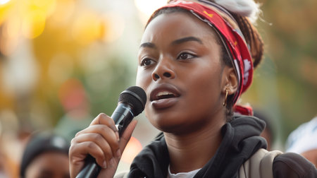 Young activist passionately addresses a crowd, calling for social justice in a lively atmosphere.