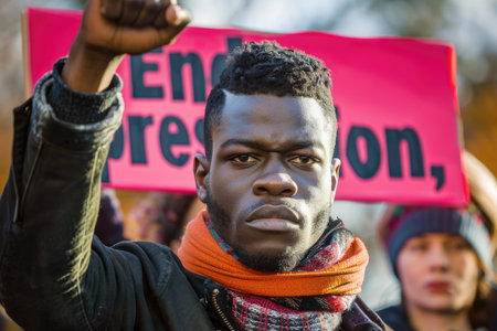 A young man raises his fist in the air, his face set in a determined expression. He stands amongst a crowd of protestors, a sign reading End Oppression visible behind him.