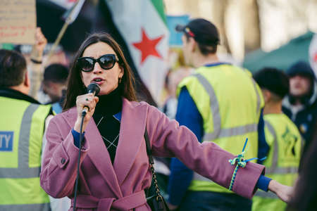 Downing Street, London | UK - 2022.03.19: Syrian and Ukrainian people protest, gather to demand tougher sanctions on Russia from British Government, EU and USA to stop the war in Ukraine