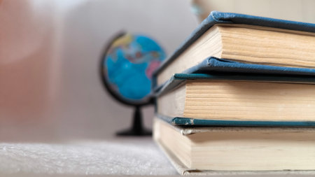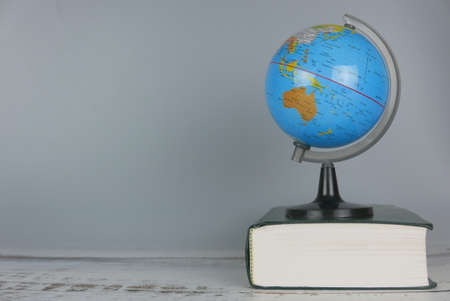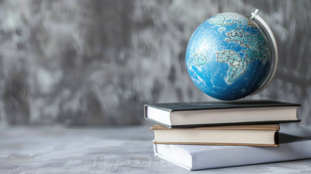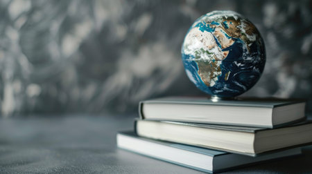 a stack of white books with an earth globe placed on top, set against a neutral gray background, the foreground is blurred to draw focus to the books and globe