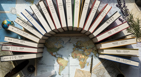 A wooden table has an open book on it with colorful flags and a globe in the background, emphasizing the themes of knowledge, exploration, and diversity