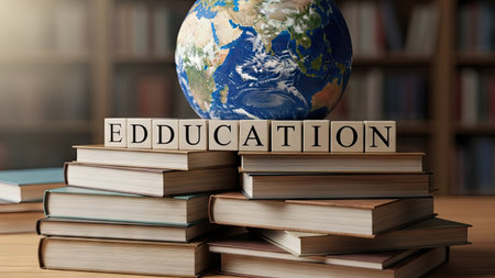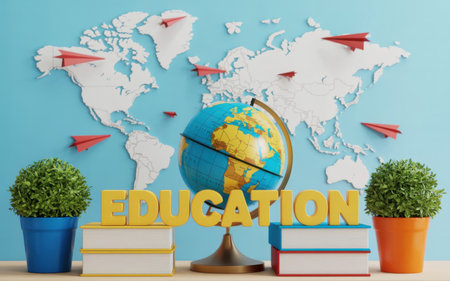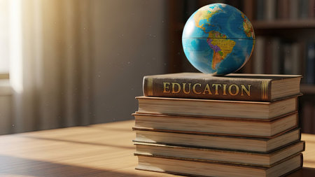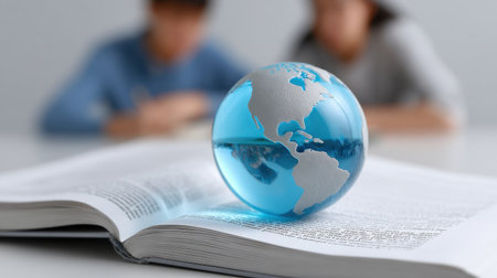 A glass globe rests on an open book, symbolizing the pursuit of knowledge and education. Two students engage in learning in the background, creating a vibrant scene.