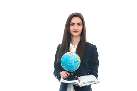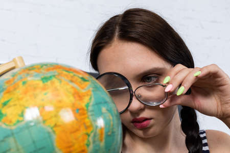 Despite the thick glasses on the glasses, a teenager is watching a small globe through a large magnifying glass. Interesting geography lesson about our planet.