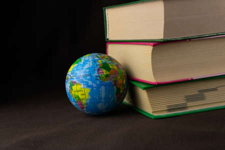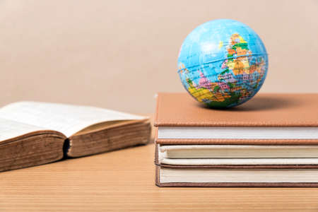 A globe sits on a table with a stack of books and a pencil holder. Concept of education and learning, as the globe represents the world and the books represent knowledge