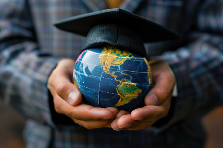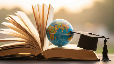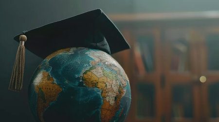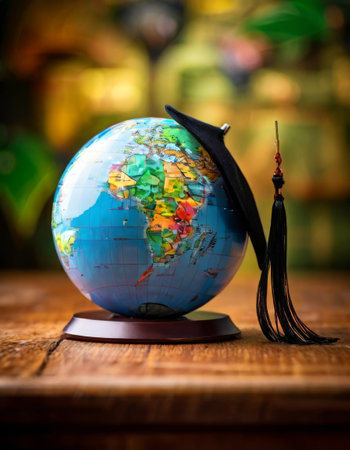 Graduation cap placed on a globe signifies global education and achievement in a vibrant atmosphere
