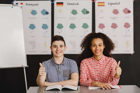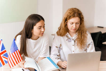 Teacher of english asks student in white class using laptop. 2 girls student answers to teacher. Working in group. Study english and british language.