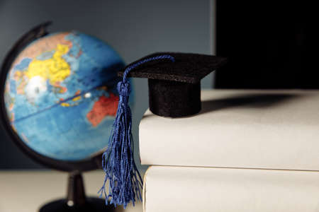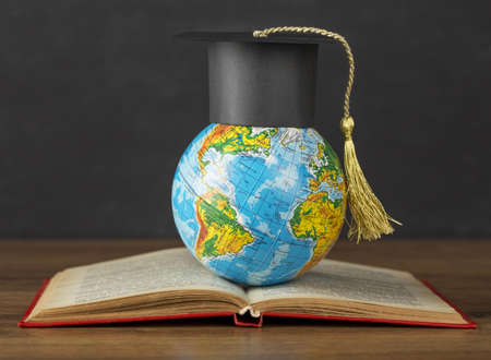 Graduation cap with Earth globe. Concept of global business study, abroad educational, Back to School. Education in Global world, Study abroad business in universities in worldwide. language study