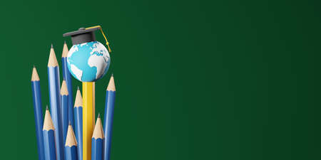 Study abroad and education concept design of yellow pencils with world and graduation cap on green background 3D render