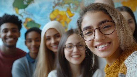 A diverse group of students is gathered around a globe, engrossed in exploration and study, their vibrant energy captured against a pristine white background, symbolizing unity and curiosity in their educational journey