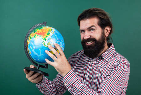 nice smile. ready for studying. nonformal education. male student in school classroom while geography lesson. pass the exam. learning the subject. happy geographer man with beard look at globe