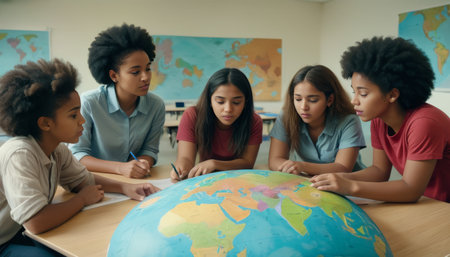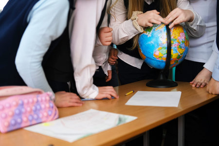 Children collaborating around a globe on a table, exploring geography concepts together, highlighting teamwork and enthusiasm for learning in a classroom setting