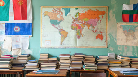 A vibrant classroom scene featuring a detailed world map affixed to a wall, surrounded by neatly stacked books, perfect for promoting learning and exploration.