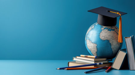Symbolizing global education, a graduation cap adorns an Earth globe model against a pastel backdrop, with room for additional content.