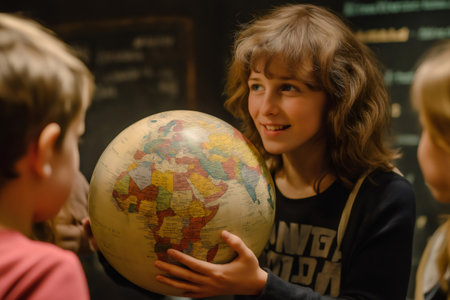 Girl holding a globe while teaching geography to two eager students in a vibrant classroom, fostering curiosity and knowledge about the world