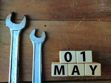first May is celebrated as Labourers day , poster of may day celebration with tools on Wooden background.