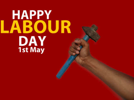 May first International Workers Day. International Workers Day with hammer in hand on Red background