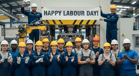 Group of factory workers with happy labor day sign in factory. Happy labor day concept.