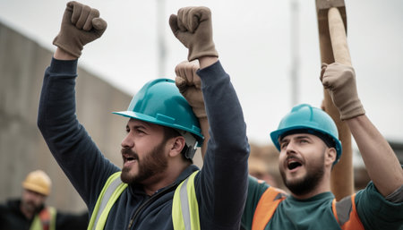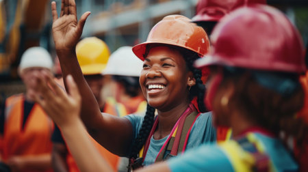 Diverse team of construction workers celebrating success at a construction site