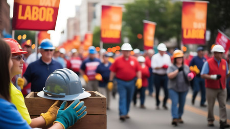 Crowd marching on Labor Day holding colorful banners celebrating workers' rights and achievements