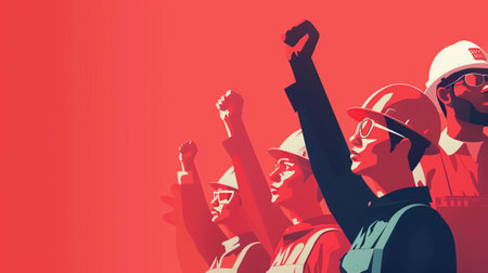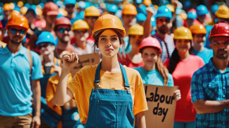 Labor day happy workers marching labour public event May 1 celebration banner demonstration worker activist crowd march solidarity union movement work employee equality equity ceremony public teamwork