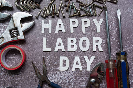 Happy labor day text with repair equipment and many handy tools on grunge grey concrete background