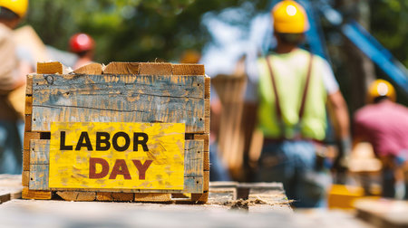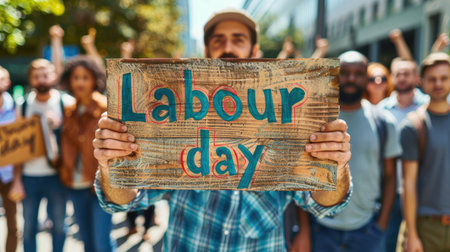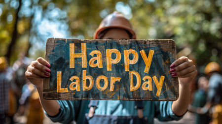 Person holding a rustic Labor Day sign outdoors, celebrating the holiday with blurred nature background. With Generative AI technology.