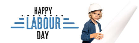 boy in safety helmet and costume of architect holding blueprint happy labor day lettering on white, banner