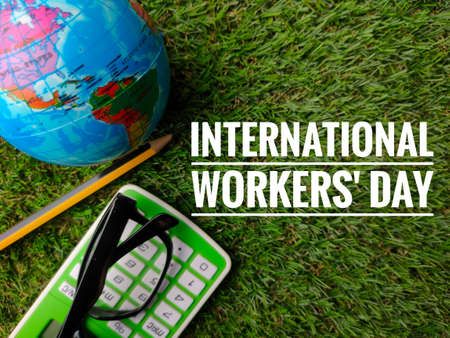 Top view globe,pencil and calculator with phrase INTERNATIONAL WORKERS' DAY on grass background.