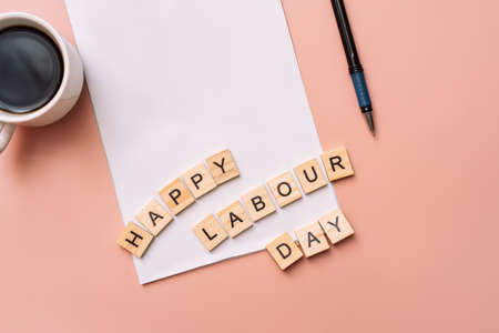 Words happy labor day are laid out on paper next to cup and pen