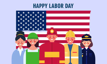 Happy labor day. various occupations people standing with american flag