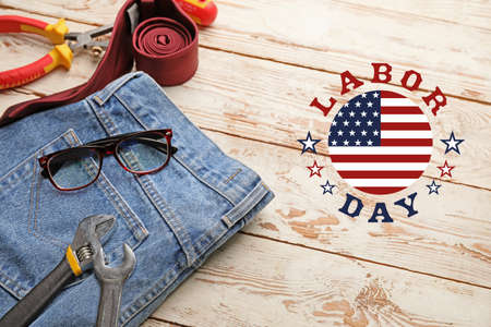 Set of tools and jeans on wooden background. Labor Day celebration