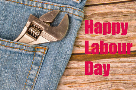 USA Labor day concept. Different kinds on wrenches, handy tools, tag on blue jeans background.