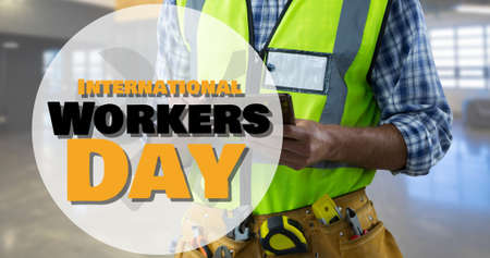 International workers day text on midsection of caucasian labor with digital tablet. digital composite, blue-collar worker, skilled, industry and technology concept.
