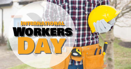 Digital composite of international workers day text on midsection of caucasian construction man. blue-collar worker, skilled and industry concept.
