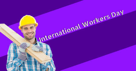 Smiling caucasian construction worker holding planks by international workers day. digital composite, blue-collar worker, skilled and industry concept.