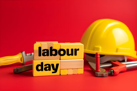 Square letters with text LABOUR DAY with hammper, pliers and wrench.
