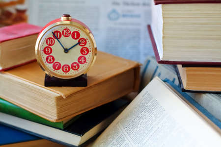 Reading books. Cover of an old book. A fascinating reading. Letters and words. The book is on the table.