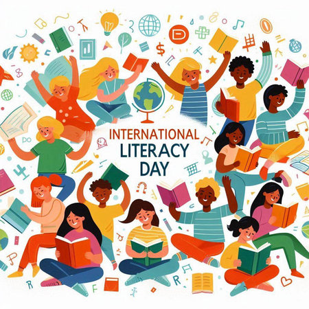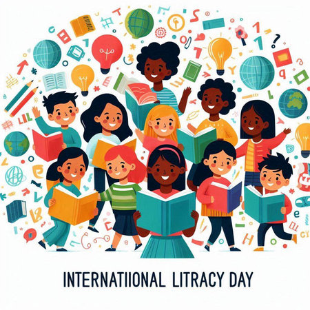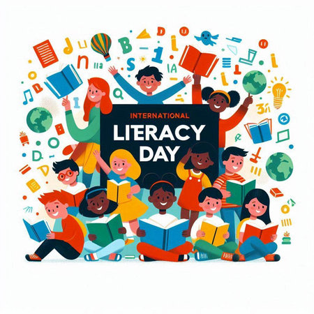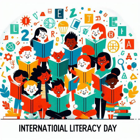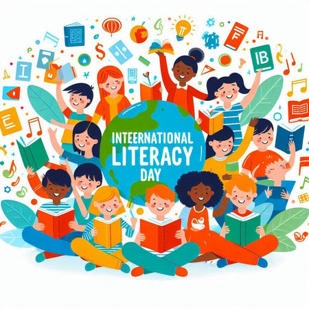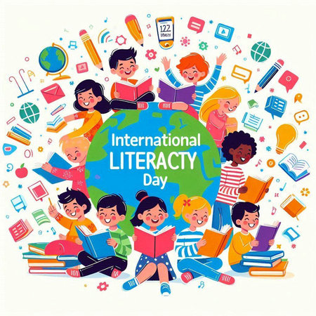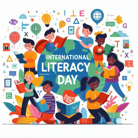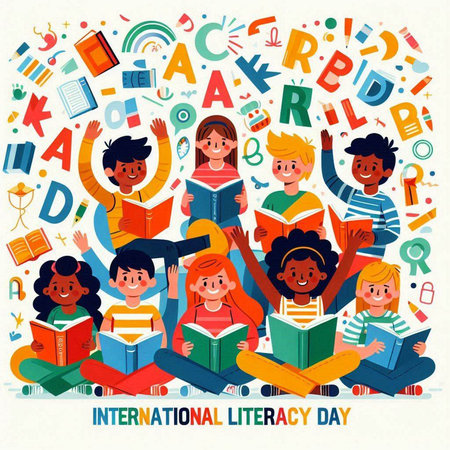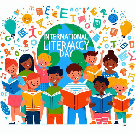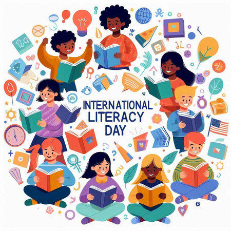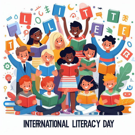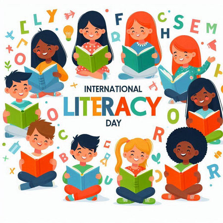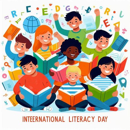 Happy international literacy day. Group of kids reading books and learning. Vector illustration.